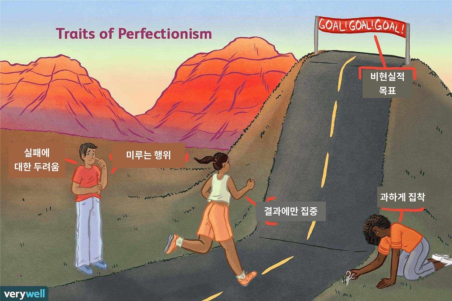 완벽주의자는 본인의 기준에 미치지 못하는 결과물을 보며 스스로 깎아내리고, 자책하는 굴레에 빠지는 사람들을 말합니다. 그들은 이런 경험을 반복하다가 지쳐 포기해 버리죠.